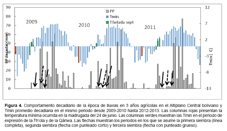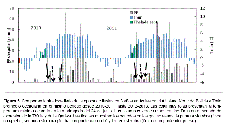 Las Figuras 4 y 5 muestran que las temperaturas ocurridas en San Juan presentaron una notoria correlación con la precipitación del siguiente año hidrológico, lo cual es confirmado, aunque con pocos datos, en la Figura 6 a) y b). Igualmente se aprecia, en ambas zonas, que las temperaturas más bajas que pudieron producir daños en las flores de Thola y/o Qáriwa se relacionan con consecuentes periodos de siembra con poca o ninguna precipitación. Por ejemplo en el Altiplano Central, en 2009, en la primera quincena de septiembre, se presentaron temperaturas muy bajas, con presencia de heladas diarias, mientras que la segunda quincena de Septiembre y la primera de Octubre presentaron temperaturas más benignas por encima de 0°C que permitieron el desarrollo y la expresión de las plantas. A estos comportamientos les siguen que si la papa se hubiera sembrado en la primera siembra, hubiera sufrido de un largo periodo sin lluvia, en cambio, la segunda y tercera siembra se muestran más adecuadas para llevar adelante el cultivo con poco estrés.
