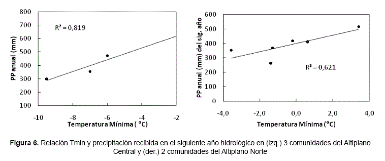 Los resultados de ambas expresiones se presentan en las Figuras 4 y 5 para las zonas del Altiplano Norte y Altiplano Central respectivamente. La mayor cantidad de datos diarios disponibles permitió analizar tres años en las comunidades del Altiplano Central y solo dos en el Altiplano Norte.