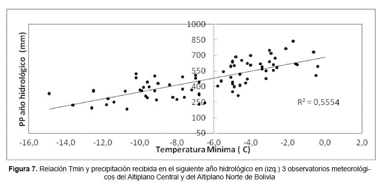 El valor de las expresiones mostradas por los indicadores observados por los productores fue evaluado en función de su confiabilidad y su potencial de extrapolación. En este sentido, los productores ponen mucho énfasis a las observaciones realizadas en el solsticio de invierno hacia la escarcha que se forma en las piedras de la zona. Dada la confiabilidad que otorgada y la relativa facilidad para encontrar los datos de Tmin de algunos observatorios altiplánicos, se realizó un estudio sobre la relación de las temperaturas mínimas alcanzadas el 24 de junio de varios años en las estaciones meteorológicas de Patacamaya, El Alto, Oruro y Caracollo, estaciones situadas en el Altiplano Norte y Central de Bolivia con registros relativamente largos y confiables de Tmin diaria. La Figura 7 muestra que efectivamente las temperaturas mínimas de muchas localidades de la zona altiplánica presentan una fuerte correlación con la precipitación del siguiente año hidrológico. En su estudio relacionado a la visibilidad de las Pleyades, Orlove et al. (2000) y Orlove et al. (2002), describen que su menor visibilidad hacia el Este de los Andes cuando los años no serán favorables hidrológicamente, se debería a una acumulación de humedad en la atmósfera alta del Este de Sud América que es impedida de llegar a los Andes por la fuerza de empuje del anticiclón del Pacífico que trae condiciones secas desde el Oeste (Figura 8). Este mismo proceso, podría ser el que provoca condiciones de baja humedad atmosférica, que favorece la reducción de la temperatura mínima.