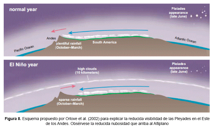 Esta información provino de los Datos de Extinción Atmosférica medidos por el Experimento de Gases y Aerosoles Estratosféricos II (SAGE II) que reportan aumentos de cobertura de nubes tipo cirrus tropicales en años cálidos del ENSO en relación con años ENOS fríos sobre los Andes centrales. A una altura de 14.5 kilómetros, la cantidad de nubes aumenta desde aproximadamente 35% en años ENOS fríos a 50 % en años ENSO cálidos. Las nubes cirrus altas tropicales solo enmascararían las Pléyades sin cubrirlas completamente, pues los datos de SAGE II muestran que la mayoría de estas nubes altas son subvisuales y solo oscurecen o hacen borrosa la visión pero no la cubren completamente. Entonces, los cambios en la cantidad de nubes tipo cirrus entre años ENSO cálidos y fríos conducen a cambios en el brillo de las Pléyades reduciendo visiblemente su brillo aparente. La ocurrencia de un año ENSO cálido conduce subsecuentemente a condiciones secas en los Andes centrales con menor precipitación en función a la intensidad del fenómeno.