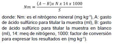 El diseño experimental utilizado fue de completamente al azar con tres repeticiones y un arreglo bifactorial. El factor A fue Con Bioinsumo (CB) y Sin Bioinsumo (SB) y el factor B por la dosis de estiércol (0, 10, 20 ton ha-1), haciendo un total de 18 unidades experimentales. Los tratamientos fueron: SB+0 ton est; SB+10 ton est; SB+20 ton est; CB+0 ton est; CB+10 ton est; + CB+20 ton est., cada tratamiento con tres repeticiones haciendo un total de 18 unidades experimentales. Las unidades experimentales fueron constituidas por frascos de acrílico de 110 ml de capacidad. Para la evaluación del nitrógeno mineral fueron colocados tres frascos de acrílico al interior de un frasco de vidrio de capacidad de 1500 ml, la cual contenía una tapa de rosca plástica. Todas las unidades experimentales fueron mantenidas en incubadora, en ausencia de luminosidad y a una temperatura de que varió entre 13 a 15 grados centígrados. La humedad fue mantenida a valores cercanos a la capacidad de campo (18%) y la aireación fue controlada abriendo los frascos cada 2 a 3 días por 15 minutos, aproximadamente, para favorecer la oxigenación. La evaluación del nitrógeno mineral fue realizada a los 0, 5, 10, 14 20, 30, 50, 80, 110 y 140 días después de la incubación, en cada fecha de muestreo fueron analizados el nitrógeno mineral como amonio (y nitratos (según la metodología propuesta porTedesco (1995), en la que, una muestra de 12,5 gramos de suelos fue agitado con 50 ml de una solución de KCl 1M posteriormente agitada durante 30 minutos a 180 rpm en un agitador mecánico anual. Para la determinación de amonio, se utilizó 0,2 gramos de óxido de magnesio, el cual fue destilado durante dos minutos, recolectándose un volumen de 35 a 40 ml, recogido en un matraz con 5 ml de acido bórico como indicador. Para la determinación del nitrógeno en forma de nitratos, la muestra agitada con cloruro de potasio, fue tratada con 0,2 gramos de aleación de varda, destilado por dos minutos y recolectada en un matraz con 5 ml de acido bórico como indicador. El nitrógeno mineral fue determinado con la siguiente expresión: