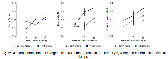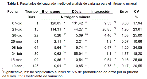 De acuerdo al cuadrado medio del análisis de varianza (Tabla 1), el nitrógeno mineral (amonio y nitratos) en ciertas fechas es significativo para el Bioinsumo y dosis, es decir que estos factores influyeron en el contenido de nitrógeno mineral, sin embargo no se pudo apreciar una interacción entre estos dos factores para el comportamiento del nitrógeno mineral. Para otras fechas, no hubo diferencias para el nitrógeno mineral debido a la presencia del bioinsumo o la dosis. Estos resultados, muestran que el nitrógeno mineral es un parámetro sensible a la dosis de estiércol aplicado al suelo, la misma pudiera estar asociada a las variaciones de temperatura, humedad y presencia de microorganismos. Asimismo, Galvis y Hernandes (2004), mencionan que la tasa de mineralización no es constante y cambia bajo las mismas condiciones de humedad y temperatura, de acuerdo a las características del suelo, ambiente y sistema de producción.