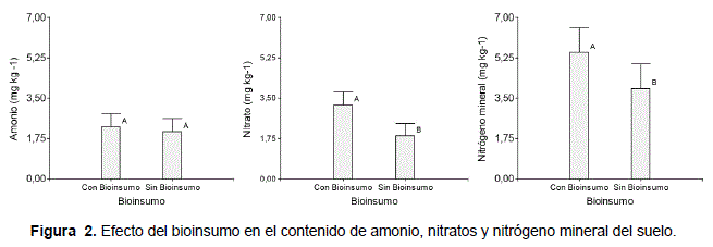Según la figura 2, el efecto del bioinsumo no ocasiono diferencias significativas al 5% en la generación de amonio (Figura 2a). En cambio, el bioinsumo incidió a la mineralización del nitrato y también del nitrógeno mineral en su totalidad. Este hecho pudo deberse a la acidez del bioinsumo, la cual según las especificaciones técnicas de PROINPA, el pH de este insumo es de aproximadamente 3,5 y el amonio es mas disponible a pH básicos.