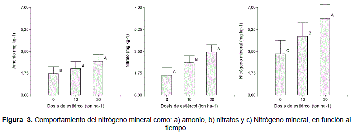 En relación a la dosis de aplicación, hubo mayor generación de amonio, nitratos y por lo tanto de nitrógeno mineral, a medida que la dosis de estiércol fue incrementado (Figura 3).