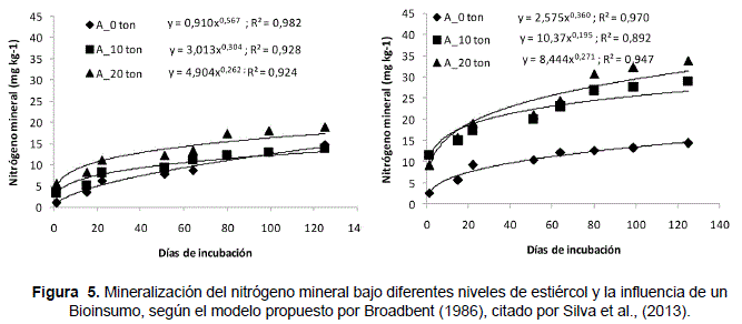 En relación a la tasa de mineralización, el modelo aplicado fue el propuesto por Broadbent (1986), el cual es una función potencial. De acuerdo a este modelo, la mineralización del nitrógeno fue influenciada por la adición de la Terrabiosa y las dosis de estiércol, llegando a producirse 28 y 33 mg de nitrógeno mineral por kg de suelo en presencia de la Terrabiosa y a 10 y 20 ton ha-1de estiércol respectivamente, frente a 13 y 19 mg kg-1 sin influencia del Bioinsumo y bajo los mismos niveles de estiércol (Figura 5). Pese a estos resultados, los valores de nitrógeno mineral son menores en relación a los reportados en otros trabajos (Flores, 2008; De Oliveira et al., 2002).