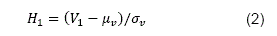 donde son la media y variación estándar de datos simulados respectivamente. V1 es la desviación estándar ponderada de L-coeficiente de variación que tiene la siguiente definición: