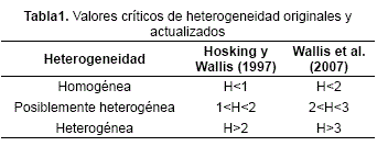 El criterio de homogeneidad utilizado en la guía metodológica de la UNESCO (2010) se basa en Hosking (et al, 2007), quienes sugieren los siguientes rangos, a diferencia de los rangos originales descritos por Hosking y Wallis (1997), presentados en la Tabla 1.
