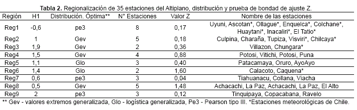 Una vez determinadas las regiones homogéneas se prosiguió con la selección de la distribución de probabilidad regional, los resultados de este análisis son detallados en la Tabla 2, de la misma forma se identifican las estaciones pertenecientes a cada región y el resultado de la prueba de bondad de ajuste ZDIST, las regiones contemplan un valor de Z menor a 1.64, por lo tanto las distribuciones se ajustan adecuadamente a los datos observados.
