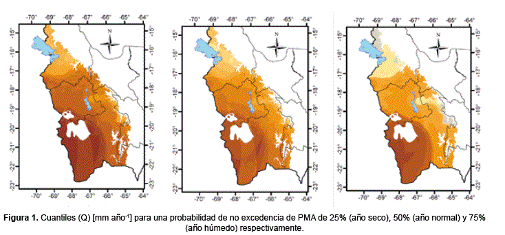 Para el análisis de precipitación media anual (PMA) se realizó el análisis con probabilidades desde 0,1 hasta 0,9. De forma general, para todas las probabilidades de estimación de cuantiles se confirmaron mayores concentraciones de PMA en el Altiplano norte y central comparado con el Altiplano sur. La Figura 1 muestra el mapeo espacial de cuantiles (Q) [mm año-1] a una frecuencia de 0,25 (año seco con 25% de probabilidad no excedencia de PMA), 0,5 (año normal con 50% de probabilidad no excedencia de PMA) y 0,75 (año húmedo con 75% de probabilidad no excedencia de PMA) respectivamente. Para un año seco el PMA oscila desde 65 mm año-1 en zonas más áridas (Altiplano sur) hasta 520 mm año-1 en las zonas más húmedas (Altiplano norte). Para un año normal el PMA va de 115 mm año-1 en el sur hasta 650 mm año-1 en el norte y para un año húmedo el PMA alcanza unos valores de 142 mm año-1 en el sur hasta 840 mm año-1 en el norte.