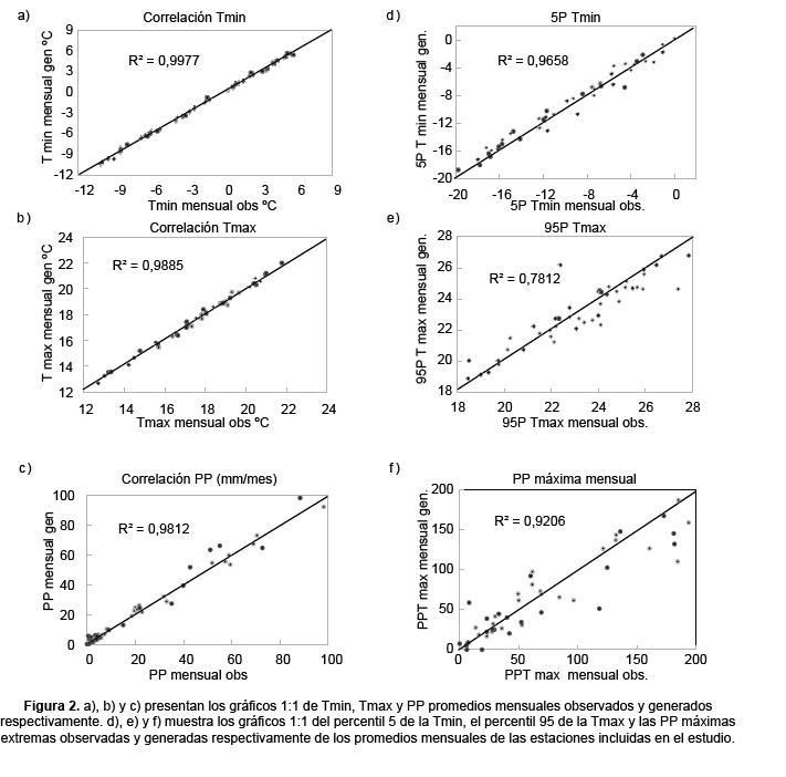 Para la validación del LARS-WG, los valores promedio mensuales de temperatura mínima (Tmin), temperatura máxima (Tmax) y precipitación fueron reproducidos por el modelo LARS-WG. La Figura 2 muestra los gráficos 1:1 de Tmin(a), Tmax (b) y precipitación(c) observada y generada de las estaciones incluidas en el estudio junto a los valores de coeficiente de determinación (R2) de las relaciones obtenidas. La Figura 2 también muestra los gráficos 1:1 del percentil 5 de la Tmin (d),el percentil 95 de la Tmax (e) y precipitación máxima extrema (f) observada y generada de las estaciones estudiadas, también con su valor de coeficiente de determinación (R2). En todos los casos se aprecia una alta capacidad para generar valores a partir de datos de clima tanto en variabilidad, promedios y extremos. Por lo que se deduce que el modelo podría reflejar las condiciones climáticas para el futuro en las localidades de Oruro, Patacamaya, Río Mulatos y Uyuni.