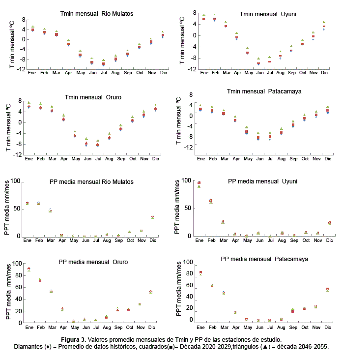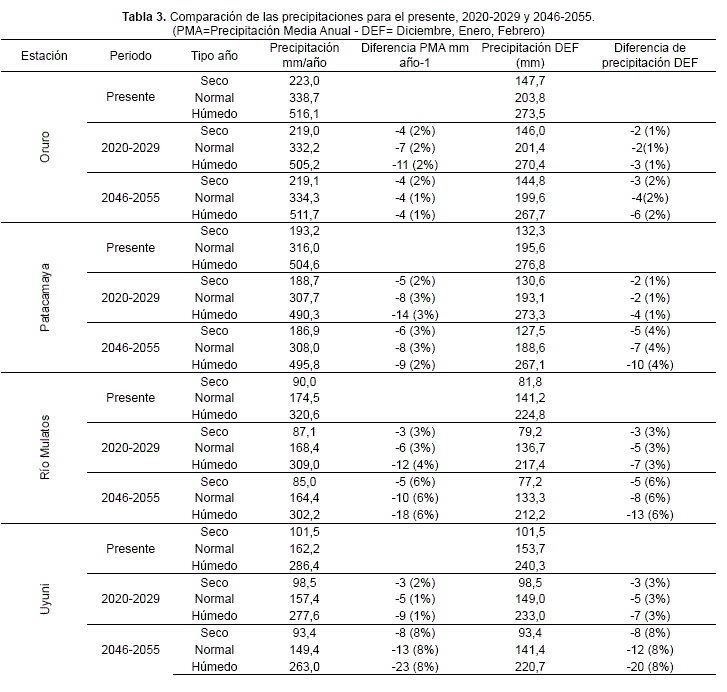 Oruro y Patacamaya proyectan para las décadas 2020-2029 y 2046-2055 una disminución de la precipitación. En la década 2020-2029 la variación va de 4 a 14 mm año-1, lo que representa 2 a 3% de precipitación, en la década 2046-2055 la variación oscila entre 4 a 9 mm año-1 lo que representa entre 1 a 3% de precipitación. Para la década 2020-2029, Río Mulatos y Uyuni proyectan una disminución de la precipitación media anual de 3 a 12 mm año-1 (1 - 4%). Para la década 2046-2055 esta diferencia asciende de 5 a 23 mm lo que representa entre 6 a 8% de precipitación. Para estas cuatro localidades, la década 2020-2029 proyecta una disminución en la precipitación acumulada promedio de los meses más lluviosos (diciembre, enero y febrero). En el Altiplano central (Oruro y Patacamaya), la disminución en esta década es de 1 % lo que representa entre 2 a 4 mm de precipitación. En el Altiplano sur (Rio Mulatos y Uyuni), el decremento de la precipitación es de 3% lo que representa una precipitación de 3 a 7 mm.