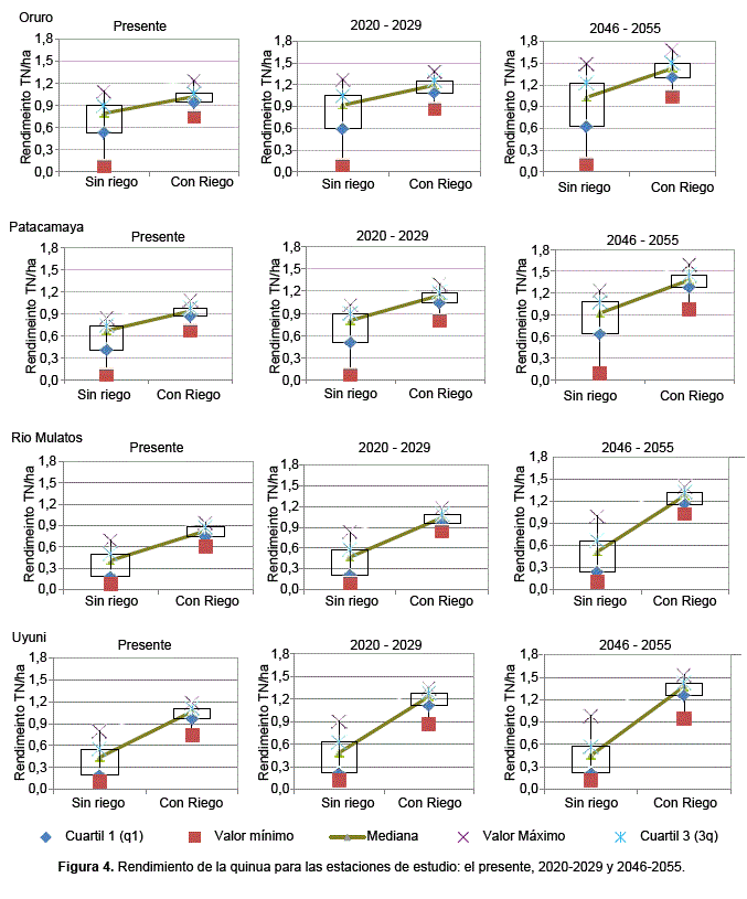 Tanto en el Altiplano central como en el sur se observó un incremento en el rendimiento, con o sin la aplicación de riego, para las décadas 2020-2029 y 2046 2055, lo cual puede deberse al incremento de la temperatura, presentando una disminución al estrés de este factor. Además puede influir el incremento de concentración de CO2, factor que intervendría en la fotosíntesis de la quinua.