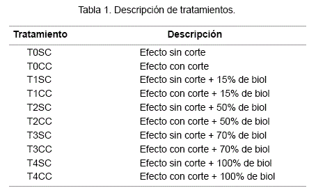 La descripción de la combinación de los factores de estudio se presenta en la Tabla 1. El análisis de datos se realizó con el programa SAS (Statistical Analysis System).