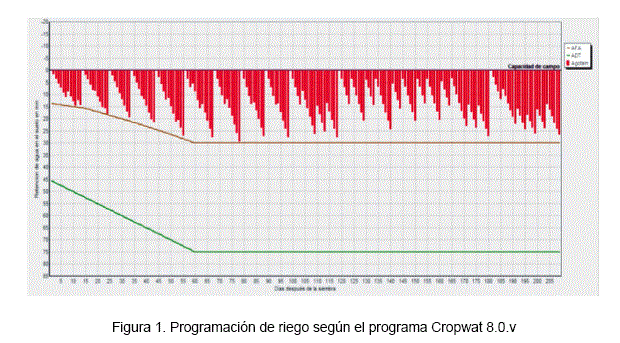 Para la programación de riego de forma teórica, la misma elaborada con el programa Cropwat 8.0 donde nos daAFA(Agua Fácilmente Aprovechable), ADT (Agua Disponible Total), determinando de forma matemática para saber cuándo y cuánta agua se debe aplicar al cultivo. Para el análisis fue necesario conocerlas características del cultivo, las características físicas del suelo y las condiciones climáticas de la zona. Con la programación del riego se puede perseguir una maximización de la producción, de la calidad de los productos, ahorro de abonos y uso de agua.