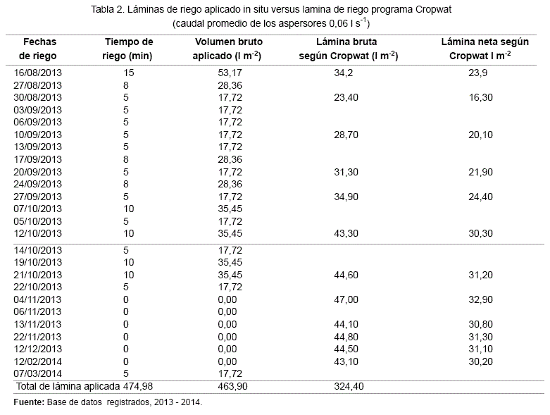 Los datos de las láminas aplicadas en relación al tiempo en una superficie total de la parcela de 230.05 m2 se presentar en la Tabla 2 donde se hace la comparación entre el volumen bruto aplicado in situ versus la lámina de riego aplicado según el programa Cropwat 8.0.