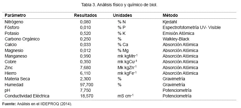 Los parámetros del análisis del biol realizado en el laboratorio del IIDEPROQ se muestran en la Tabla 3.