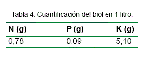 La determinación y cuantificación se realizó en base a Volumen vs Masa, se pesó un litro de biol triplicando el volumen con un promedio de 980,988 g, y efectuó el análisis para un litro de biol de vacuno (Tabla 4).