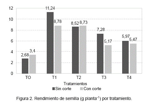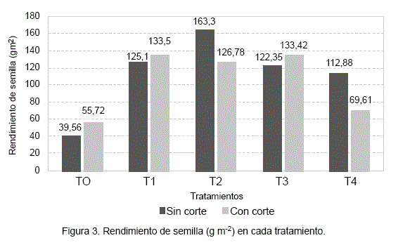 Después de la obtención de estos datos se procedió a la conversión de las plantas por tratamiento para así tener un rendimiento de semilla gramos por metro cuadrado (Figura 3). El rendimiento de semilla en g m-2 fue determinado por el número de plantas por subunidad experimental en plantas Sin Corte y Con Corte (SC y CC), donde en los T2 y T4 existe mayor producción en plantas SC en relación a plantas CC, en cambio en los T0, T1 y T3 hay mayor producción en plantas CC.