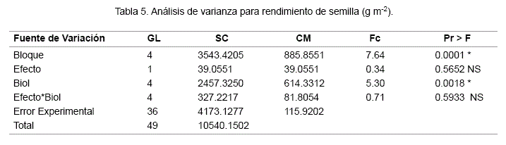 Los resultados del análisis de varianza se presentan en la tabla 5, el coeficiente de variabilidad de 49.7427 %. El análisis de varianza para la evaluación del rendimiento de semilla, reporta diferencias significativas entre la dosis del biol aplicado. También muestra diferencia significativa entre los bloques dentro de cada dosis de biol. De manera similar se evidencia que no existe diferencias significativas entre el efecto cultivo estudiado. Y existe diferencias significativas en la interacción entre la dosis de biol y efecto de corte.