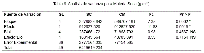 Los resultados del análisis de varianza para la materia seca (Tabla 6) reportan un coeficiente de variabilidad de coeficiente de variabilidad de 47.49%. El análisis de varianza para la evaluación de materia seca, no muestra diferencias significativas entre la dosis del biol aplicado, pero se presentó diferencias significativas entre los bloques dentro de cada dosis de biol evaluado. De manera similar se evidencia diferencias significativas entre el efecto en el cultivo estudiado.