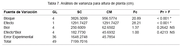 La evaluación de la altura de planta se realizó cada quince días de los tratamientos se tomó los datos de seis plantas. Con los datos obtenidos se realizó el análisis estadístico para la variable altura de planta, donde con un coeficiente de variabilidad de 8.85% (Tabla 7).