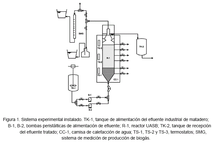 El reactor UASB fue inoculado con lodo anaerobio proveniente de los biodigestores del Centro de Investigación de Biodigestores, Biogás y Biol (CIB3), el cual se encuentra ubicado en la Estación Experimental Choquenaira (Viacha, La Paz) que pertenece a la Facultad de Agronomía de la UMSA. El proceso de adecuación y activación del lodo anaerobio, con la consecuente formación de floculos y gránulos activos capaces de producir biogás, se realizó en un tiempo de 6 meses. Durante este período, los factores que midieron la duración del proceso de activación de los microorganismos anaerobios fueron la concentración de microorganismos dentro del reactor (sólidos suspendidos volátiles) y la producción de biogás, esperando llegar hasta el estado estacionario de ambos parámetros. Además, la temperatura de operación fue de 35 °C y el tiempo de retención hidráulica de 24 horas. Como sustrato se alimentó efluente industrial de matadero cuya concentración de DQO se incrementó gradualmente desde 500 hasta 3500 mg O2 l-1. A continuación, se trabajó durante tres períodos experimentales: (a) EXP-2 con un tiempo de retención hidráulica (TRH) de 16 horas, (b) EXP-3 con un TRH de 12 horas y EXP-4