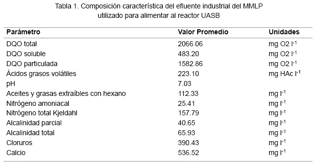 con un TRH de 8 horas, además cada período tuvo una duración de 8 días. La información generada durante EXP-2 fue utilizada para la calibración del modelo y los datos generados durante EXP-3 y EXP-4 se emplearon para la validación del mencionado modelo. La temperatura durante todos los períodos de experimentación se mantuvo constante a 35 °C, así como también la concentración de materia orgánica del sustrato cargado al tanque de alimentación (2000 ± 542 mg DQO l-1), realizándose diluciones del efluente industrial del MMLP, cuyas características se muestran en la Figura 1.