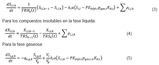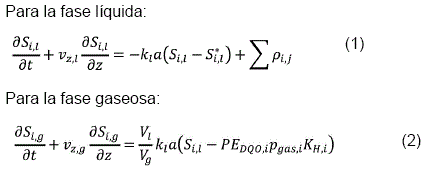 Siendo SM y Si,g, la concentración (g DQO l-1) de cualquier componente i, dentro la fase líquida y gaseosa, respectivamente. Vl y Vg, los volúmenes de las fases líquida y gaseosa, kl a, la constante global de transferencia de materia; PEDQO,i, el peso de DQO equivalente a un mol de compuestos gaseoso (g DQO/mol compuesto gaseoso); KH,i, la constante de Henry (mol/bar); pgas,i, la presión parcial del componente(bar); pu, la velocidad de reacción para cada proceso (j) en los cuales el compuesto i está involucrado, z, es la coordenada de la altura del reactor (m) y t, es el tiempo (d). Las Ecuaciones (1) y (2) representan un modelo de parámetro distribuido de gradiente máximo, cuya solución, aún a pesar de las simplificaciones realizadas, es bastante compleja.