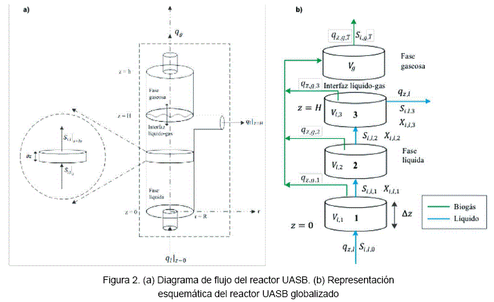 En la Figura 2 (a), se muestra el diagrama de flujo del reactor UASB. Aplicando las ecuaciones de variación de balance másico (Bird, Stewart, & Lightfoot, 1978), se obtiene un modelo de parámetro distribuido: