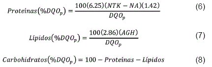 Siendo 6.25, el peso equivalente de proteínas por gramos de nitrógeno orgánico (g de proteínas/g de nitrógeno orgánico), NTK, nitrógeno total Kjeldahl (g l-1); NA, nitrógeno amoniacal (g l-1) y AGH, aceites y grasa extraíbles con hexano (g l-1). Aplicando las Ecuaciones (6), (7) y (8) a los datos de DQOP del efluente del matadero MMLP, se obtiene que la DQOP se distribuye de la siguiente forma: 74% corresponde a las proteínas, 20% a los lípidos y el restante 6% a los carbohidratos y la DQO total: 57% de proteínas, 16% lípidos, 4% proteínas y el 23% restante se distribuye entre los demás que se caracterizaron se aplicando el método sugerido por Huete et al. (2006). Los parámetros cinéticos de desintegración e hidrólisis iniciales utilizados fueron tomados de Batstone et al. (2002), sugeridos para el tratamiento de aguas residuales de matadero, el resto fueron tomados de Rosen & Jeppsson(2006).