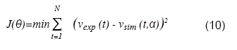 Donde la Ecuación (9) representa el cambio absoluto en una variable de salida x por un 100% en el cambio relativo del parámetro 0. En nuestro caso, la variable de salida utilizada fue la reducción de materia orgánica y los parámetros fueron las constantes cinéticas del proceso de digestión anaerobia. Luego, los valores de los parámetros de alta sensibilidad fueron estimados en base a los datos experimentales del período EXP-2, para ello se aplicó un proceso iterativo y como función objetivo se utilizó la función de mínimos cuadrados (Donoso-Bravo et al., 2011):