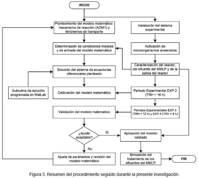 La Figura 3 presenta un resumen del procedimiento seguido durante la presente investigación. En primer lugar se planteó el modelo matemático considerando el mecanismo de reacción del ADM1 y los fenómenos de transporte que ocurren durante la digestión anaerobia del efluente del MMLP. De forma paralela se instaló el sistema experimental y se procedió a la activación de los microorganismos anaerobios. A continuación, a través de métodos analíticos, se caracterizó la alimentación y la salida del reactor, así como también cada una de las zonas del reactor. Esta información nos sirvió para establecer las condiciones iniciales y los datos de entrada del modelo matemático. Luego, se trabajó durante los períodos experimentales mencionados anteriormente (EXP-2, EXP-3 y EXP-4) para obtener la información necesaria para calibrar y validar el modelo matemático. Las variables medidas fueron: (a) pH, (b) reducción de materia orgánica en términos de DQO y (c) flujo de biogás. Finalmente se simuló el tratamiento del efluente industrial del MMLP bajo condiciones reales de operación y en base a un análisis de su composición.