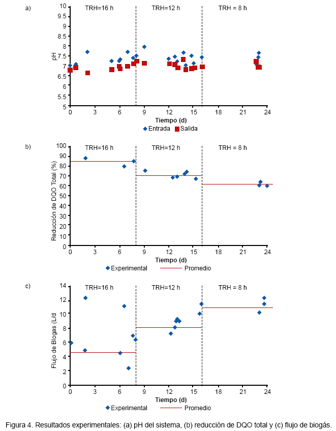 El efecto de la capacidad buffer del sistema se ve reflejado en la estabilidad del pH del sistema (Figura 3), pues el valor promedio de pH a la salida del reactor es de 7.002 y el de ingreso 7.40 en promedio. La disminución se debe a la producción de ácidos grasos volátiles durante la digestión anaerobia, sin embargo, este descenso es controlado debido a la alcalinidad del sistema y el nitrógeno amoniacal del sustrato que neutralizan a los ácidos producidos. Este comportamiento también fue reportado por Caldera et al. (2003). Respecto a la reducción de DQO total, se puede notar que en promedio para un TRH = 16 h el porcentaje total de materia orgánica reducida fue de 85%, para TRH = 12 h 69 % y para TRH = 8 h 58%, estos resultados tienen similitud con los reportados en Manjunath et al. (2000). En lo referente al flujo de biogás, se puede observar que para cada tiempo de retención existe una marcada diferencia entre los caudales de biogás producidos. En promedio el caudal de biogás fue 4.56 l d-1 para TRH = 16 h, 8.22 l d-1 para TRH = 12 h y 11.19 l d-1 para TRH = 8 h. El incremento de la producción del flujo de biogás como resultado de la reducción del tiempo de retención hidráulica es un comportamiento que también se ha registrado en el trabajo de Sayed et al. (1987).