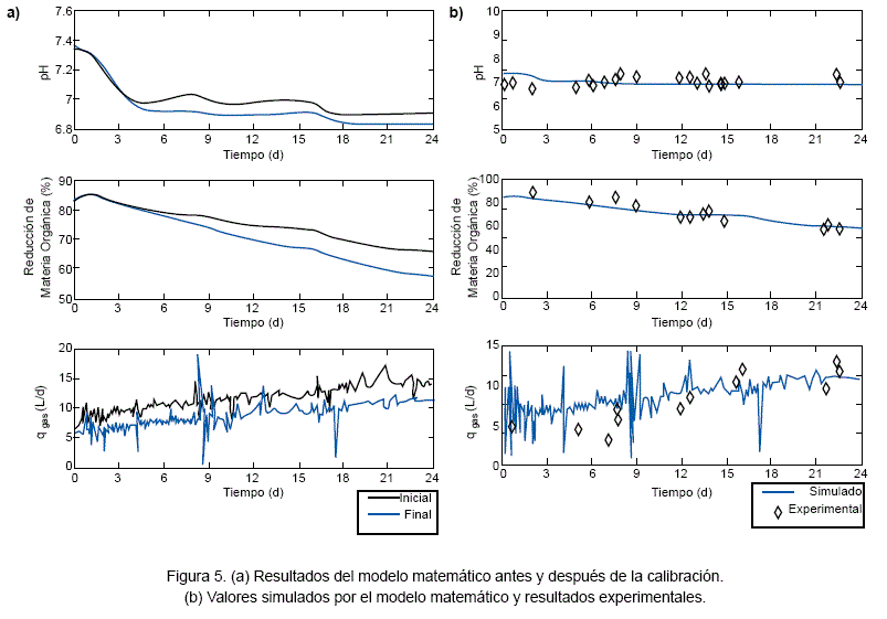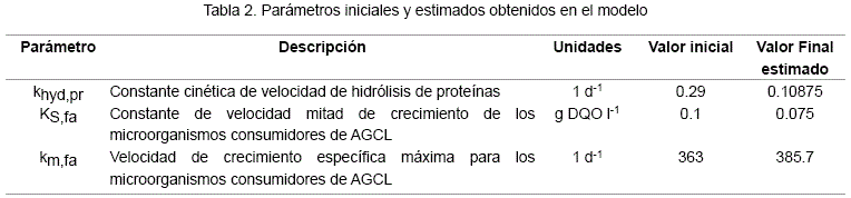 Los resultados de reducción de materia orgánica obtenidos durante el período de experimentación EXP-2 (TRH=16 h) fueron utilizados para la calibración. Para ajustar los resultados del modelo con los experimentales, se modificaron los parámetros más sensibles del modelo. El análisis de sensibilidad indica que los parámetros más sensibles para la reducción de materia orgánica son la Constante cinética de velocidad de hidrólisis de proteínas(khyd,pr), la constante de velocidad mitad de crecimiento de los microorganismos consumidores de ácidos grasos de cadena larga (AGCL) (KS,fa)) y la velocidad de crecimiento específica máxima para los microorganismos consumidores de AGCL (km,fa), esto sugiere que la hidrólisis de proteínas y que el consumo de AGCL son las etapas limitantes de velocidad del proceso de digestión anaerobia de los efluentes industriales del MMLP, este comportamiento tiene relación directa con el mecanismo de reacción propuesto en el ADM1 y con las características del efluente del MMLP, puesto que el 57% de la DQO total del efluente corresponde a las proteínas y un 16% a los lípidos cuyo producto de la hidrólisis son los AGCL, por lo tanto es natural que el proceso se incline hacia la degradación de estos compuestos. Como resultado del análisis de sensibilidad se han estimado nuevos valores para estos parámetros, los cuales se muestran en la Tabla 2. Los resultados del modelo antes y después de la calibración se muestran en la Figura 4(a).
