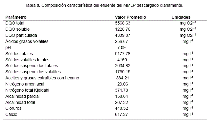 Para los análisis de DQO, ácidos grasos volátiles, pH, grasas y aceites extractables con hexano, nitrógeno amoniacal y total, alcalinidad, calcio y cloruros se aplicaron los Métodos Standard establecidos por la American Public Health Association (1995). El flujo de biogás fue medido utilizando un medidor de volumen, a través del desplazamiento de una columna de agua, cuyo pH fue de 2.00, puesto que de esta forma se evita la solubilización del CO2. Los análisis se realizaron en el Instituto de Investigación y Desarrollo de Procesos Químicos (IIDEPROQ), dependiente de la carrera de Ingeniería Química de la UMSA.