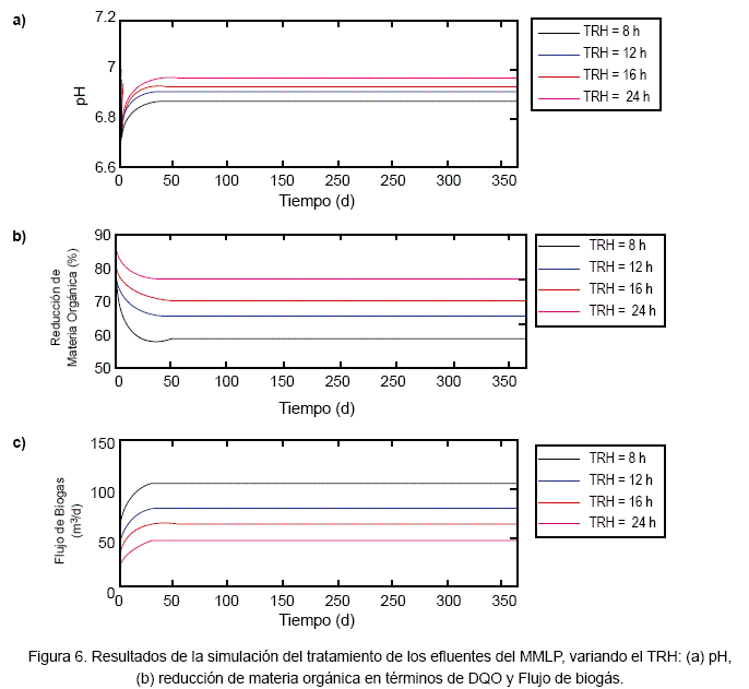 Una vez obtenido el modelo calibrado, se procedió a la simulación del tratamiento de los efluentes del MMLP. El caudal de alimentación del reactor a escala real es de 60 m3 d-1 y las características del efluente se muestran en la Tabla 3. El proceso de caracterización del efluente se realizó de la misma forma que se hizo a escala de laboratorio, a continuación se evaluó el efecto del tiempo de retención hidráulica (TRH) sobre el pH, la reducción de materia orgánica (DQO total) y la producción de biogás. Como se observa en la Figura 6, no existe variación significativa del pH respecto al tiempo de retención, sin embargo, en la reducción de materia orgánica y en el flujo de biogás existen grandes diferencias y se tiene que en el estado estacionario para un TRH de 8 horas el porcentaje de reducción de materia orgánica es de 58.4% y un caudal de biogás de 107 m3/d; para TRH de 12 horas 65.8% y 80.8 m3 d-1; para TRH = 16 horas 70.5% y 65.25 m3 &\ finalmente para TRH = 24 horas 76.2% y 47.30 m3 d-1. Esta información será de mucha importancia al momento de diseñar todo el sistema de tratamiento puesto que manteniendo el caudal constante, la única forma de variar el TRH es modificando el volumen del reactor, esto en la práctica no es posible, ya que se necesitaría construir varios reactores a escala real y realizar las pruebas, requiriendo la inversión de recursos económicos y tiempo. Sin embargo, gracias al modelo matemático se ha podido realizar este experimento con el consiguiente ahorro en recursos.