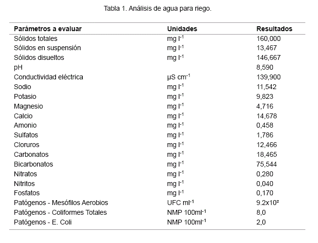 El método de riego aplicado para la complementación de agua en el cultivo, fue por aspersión tipo cañón (eficiencia del 85%). La Tabla 1 muestra los resultados del análisis físico, químico y microbiológico de la vertiente y reservorio de agua, con un pH de 8,59 que indica la existencia alta de bicarbonatos con riesgo de precipitación de CaCO3 en tuberías metálicas e indica que es mejor trabajar con instalaciones de tubería PVC, según COMPO, 2004, pero este rango indica que es aceptable para riego en cultivos.