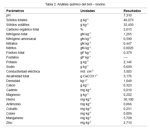 La Tabla 2, muestra los resultados obtenidos en dos oportunidades de muestreo de biol de un reservorio único. El pH de este abono líquido es neutro con un valor de 7,31 esta propiedad ayuda a que la planta se desarrolle con mayor facilidad, porque es aplicado en la parte vegetativa. La conductividad eléctrica es 3,503 mS cm-1, el nitrógeno total fue de 1,27, este elemento es vital para el desarrollo de la planta. El contenido de fósforo fue 0,38 g P kg-1 y en el contenido de potasio fue 2,15 g K kg-1; en el contenido de microelementos, se presentó el hierro con 30,10 mg kg-1 y así mismo existe presencia de 2,71 mg kg-1 del elemento Zn.