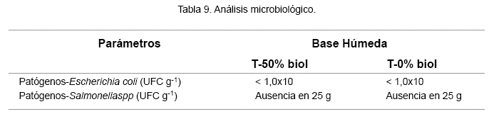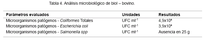 La presencia de microorganismos patógenos en cantidades no considerables (coliformes, Escherichiacoli y Salmonella spp), pero al pasar por un proceso de descomposición anaeróbica los patógenos del estiércol fueron eliminadas por las condiciones inadecuadas para estos microorganismos. (Tabla 4).
