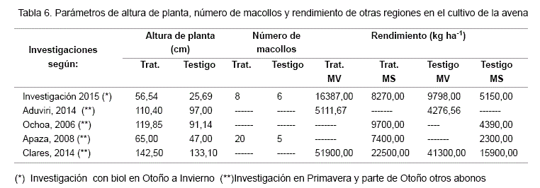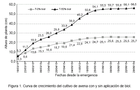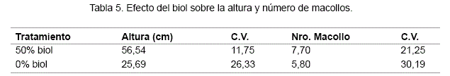 Para la variable altura de planta, el tratamiento T-50% biol alcanzo 56,54 cm de altura en épocas adversas para el cultivo (febrero a julio) y el tratamiento testigo logro una baja altura de 25,70 cm aplicando sólo agua. Las respuestas para el variable número de macollos, si bien muestran diferencias entre los dos tratamientos, observamos que al aplicar biol se puede conseguir un segundo macollamiento puesto que se acelera la fenología de la planta. Se consiguió 8 macollos en el tratamiento T-50% biol y mientras que en el testigo T-0% biol presentó 5 macollos.