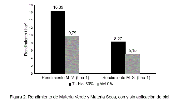 Los resultados obtenidos para el rendimiento de materia verde y seca por hectárea, los cuales se presenta en la Figura 2. Se puede apreciar que el tratamiento al que se aplicó el 50% de biol, obtuvo rendimientos de materia verde de 16,39 t ha-1, por otro lado el tratamiento del testigo logró un rendimiento de 9,80 t ha-1 en materia verde. Para el caso de la materia seca, el tratamiento que se aplicó 50% de biol, obtuvo 8,27 t ha-1 y el testigo alcanzó 5,15 t ha-1