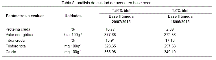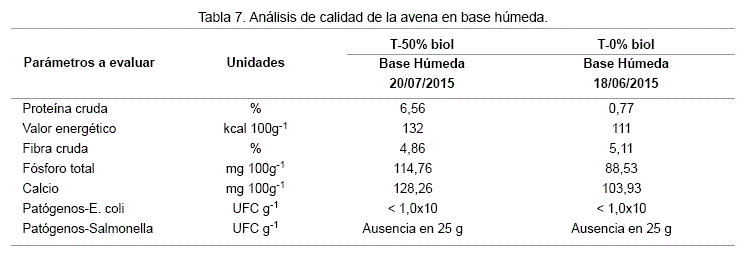 En las Tablas 7 y 8, se muestra la calidad de la avena en épocas de estiaje (épocas de otoño e invierno), para esto es necesario hacer conocer sobre el valor nutritivo en el contenido de proteína cruda, valor energético, fibra cruda, materia seca, fósforo total y calcio. Además se presentan los análisis evaluados de los parámetros microbiológicos, como la presencia de Escherichia coli y la salmonella spp. La diferencia entre tratamientos, tanto en base húmeda y base seca son diferentes en calidad de nutrimentos que contiene el cultivo de avena.