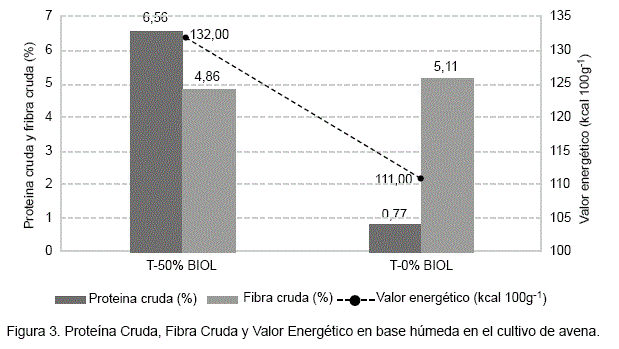 El contenido de proteína cruda alcanza un incremento mayor cuando se aplica un 50% de biol bovino por semana. En la proteína cruda en el tratamiento T-50% biol de 6,56% en proteína cruda ya que existe un incremento en comparación con el testigo de 0,77% de proteína cruda sin aplicar ningún abono y/o fertilizante. Se registra 4,86 % de fibra cruda en el tratamiento y en comparación son el testigo se obtuvo 5,11% de este parámetro evaluado. El valor energético en el tratamiento T-50% biol, alcanzó un 132,00 kcal 100g-1 y en el testigo se obtuvo un bajo resultado de 111,00 kcal 100g-1. (Figura 3).