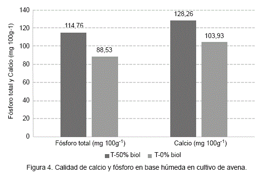 Así mismo se realizó el análisis de contenido de Fósforo y Calcio (Figura 4), en los cuales se obtuvieron diferencias significativas en el tratamiento T-50% de biol, para el fósforo total un 114,76 mg 100g siendo que en el tratamiento testigo se alcanzó 88 mg 100g-1; por otro lado se consiguieron resultados de 128 y 103 mg 100g-1 en contenido de calcio en el tratamiento de 50% biol y testigo respectivamente.