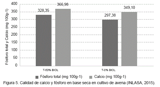 Así mismo se evaluó los análisis de contenido de Fósforo y Calcio el fósforo total en el tratamiento T-50% biol fue de 328,35 mg 100g-1 y en el testigo se logró 297,38 mg 100g-1, con una diferencia mínima entre ambos tratamientos. Respecto al contenido de calcio se obtiene resultados significativos en el tratamiento T-50% biol de 366,98 mg 100g-1 y el testigo alcanzó 349,10 mg 100g-1, lo cual nos indica que estos valores no presentan mucha diferencia, pero si tienen un contenido de calcio significativo para el ganado lechero, mostrando (Figura 5).
