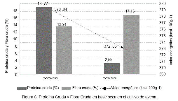 El análisis de bromatología (Figura 5), en base seca, reporta resultados muy significativos en los parámetros estudiados. Aplicando biol al 50% se consiguieron resultados mayores en proteína cruda de 18,77% en el tratamiento T-50% biol y para el testigo de 2,59% Para la fibra cruda en base seca el tratamiento alcanzo un mayor resultado con 17,16% y un 13,91% en el testigo. En el caso del valor energético, para el tratamiento T-50% biol, alcanzó un 378,84 kcal 100g-1, el testigo no reporta diferencia notoria respecto al T-50% con un 372,86 kcal 100g-1 en forraje seco.