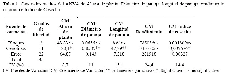 Los cuadrados medios de las variables cuantitativas (Tabla 1), muestran diferencias estadísticas entre líneas y no significativo para bloques, el porte de la planta fue erecta y sin ramificación en el tallo principal en todas las líneas.