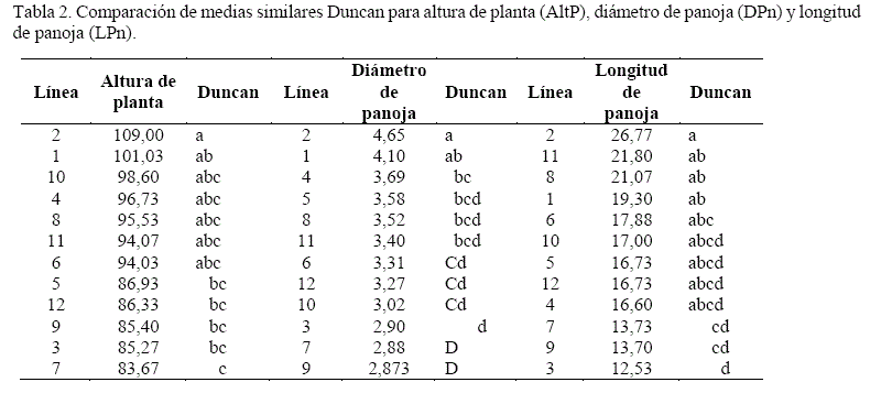 La prueba de comparación Duncan para las variables cuantitativas, la línea 2 del grupo "a" desarrolló mayor altura de planta, diámetro y longitud de panoja, la misma que está relacionada con el ciclo de la planta (162 días), por el contrario las más precoces desarrollaron menor altura de planta (Tabla 2).