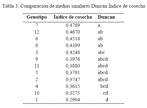 Gabriel et al. (2013) demostraron que las plantas con menor altura poseen panojas pequeñas de menor diámetro, menor rendimiento y mayor susceptibilidad al mildiu y del mismo modo, las plantas más altas tuvieron mayor longitud y diámetro de panoja, mayor diámetro de tallo, mayor rendimiento y resistencia al mildiu.La prueba de medias similares de Duncan, agrupándose en cuatro, la línea L-GO destacó mayor índice de cosecha en el grupo "a" de Duncan, y la línea 1 evidenció menor índice 0,29 en el grupo "d", es decir, las plantas llegaron a formar menos cantidad de grano en la panoja (Tabla 3). El índice de cosecha permitirá realizar selección con fines de mejoramiento, parámetro que influye en el rendimiento como la línea L-GO presenta un índice de 0,48 que a su vez contrastó con un rendimiento de 2511 kg ha"1 a nivel de parcela experimental.