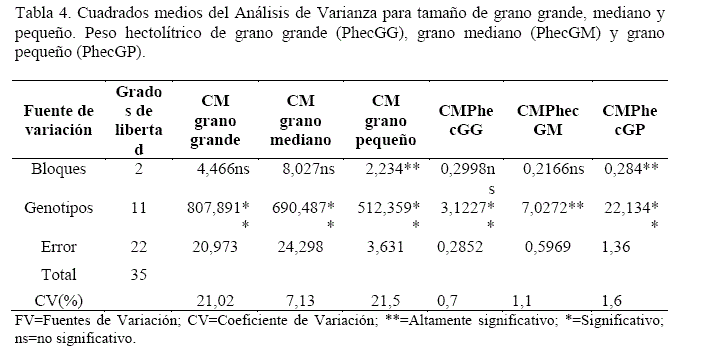 La Tabla 4, presenta los cuadrados medios el análisis de varianza para tamaño de grano grande (grano retenido en la malla de 2,0 a 1,70 mm), donde se determinó que existen diferencias altamente significativas entre líneas y no significativos para bloques.